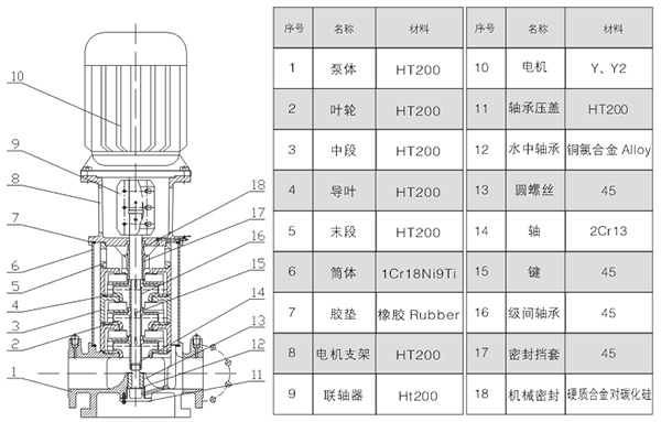 该泵具有节能、占地面积小、安装方便、性能稳定等特点。外套用1Cr18Ni9Ti优质不锈钢,轴封用耐磨机械密封,无泄漏,使用寿命长。以水力平衡解决轴向力,因而泵运转平稳,低噪音,安装条件优于DL型泵,可以简便安装于任一段水平管路中间。完全能满足高层建筑、深井矿等的给排水及消防设施需要,是广大行业冷热水或一般介质、理化性质类似水等液体输送的理想泵型。