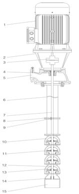 深井消防泵组由多个离心式叶轮和导流壳、扬水管、传动轴、泵座、电动机等部件组成。泵座和电机位于水池上方,电动机的动力通过与扬水管同心的传动轴传递给叶轮轴,从而产生流量和压力。