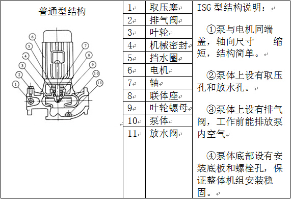 1、ISG型立式离心泵,供输送清水及物理性质 类似清水的其它液体之用。使用介质温度80℃以 下。适用于工业和城市给排水、高层建筑增压送 水、园林喷灌、消防增压、远距离输水、采暖、浴室冷暖水循环增压及设备配套等。