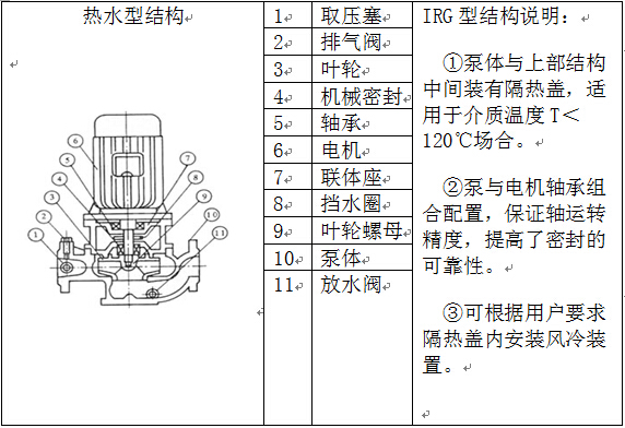 2、IRG型立式热水泵,适用于有供热系统的民用及企事业单位的建筑住房供暖及热水增压、循环、输送等生产工艺用热系统,如:电站、热电站、余热利用、冶金、化工、纺织、木材加工、造纸、食品、制药和合成纤维等部门,使用温度120℃以下。